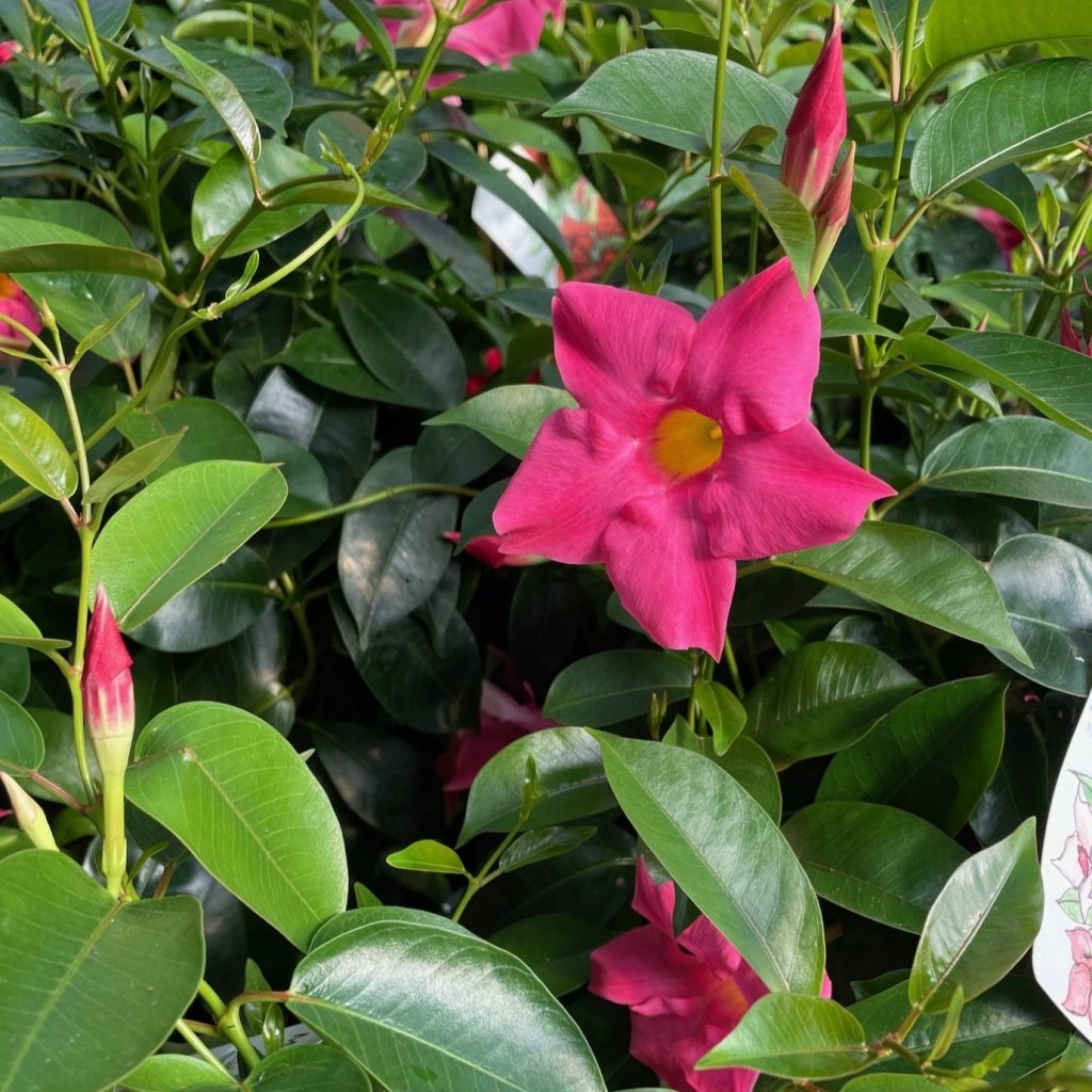 Mandevilla is a tropical plants with beautiful showy flowers. The blooms can be red, pink, or white, depending on the variety, and will be trumpet-shaped.