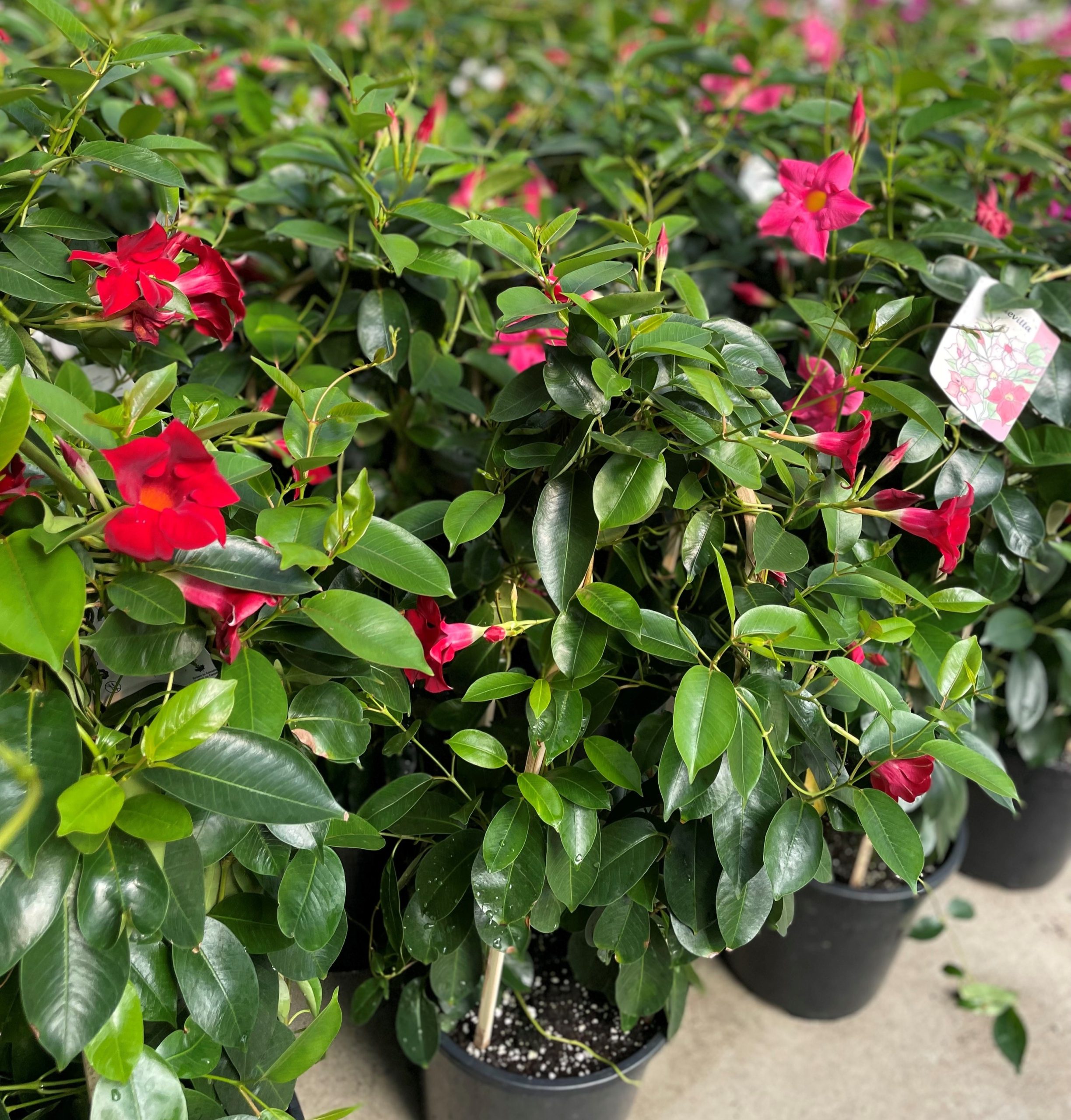 Mandevilla will vine out—sometimes over 20 feet which works well on a trellis or arbor. Need a Trellis? Shop Trellises & Obelisks here