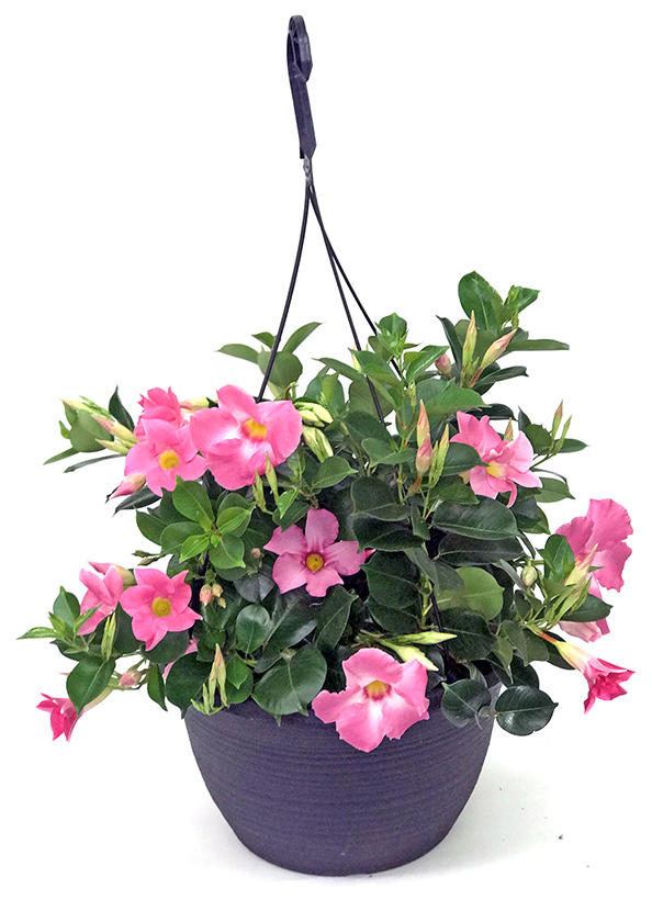 The Mandevilla is a tropical plant with beautiful showy flowers. The blooms can be red, pink, or white, depending on the variety, and will be trumpet-shaped. Mandevilla will vine out which works for a hanging basket, trellis or arbor. Need a Trellis? Shop Trellises & Obelisks here