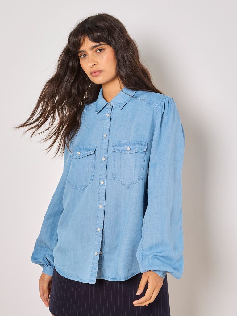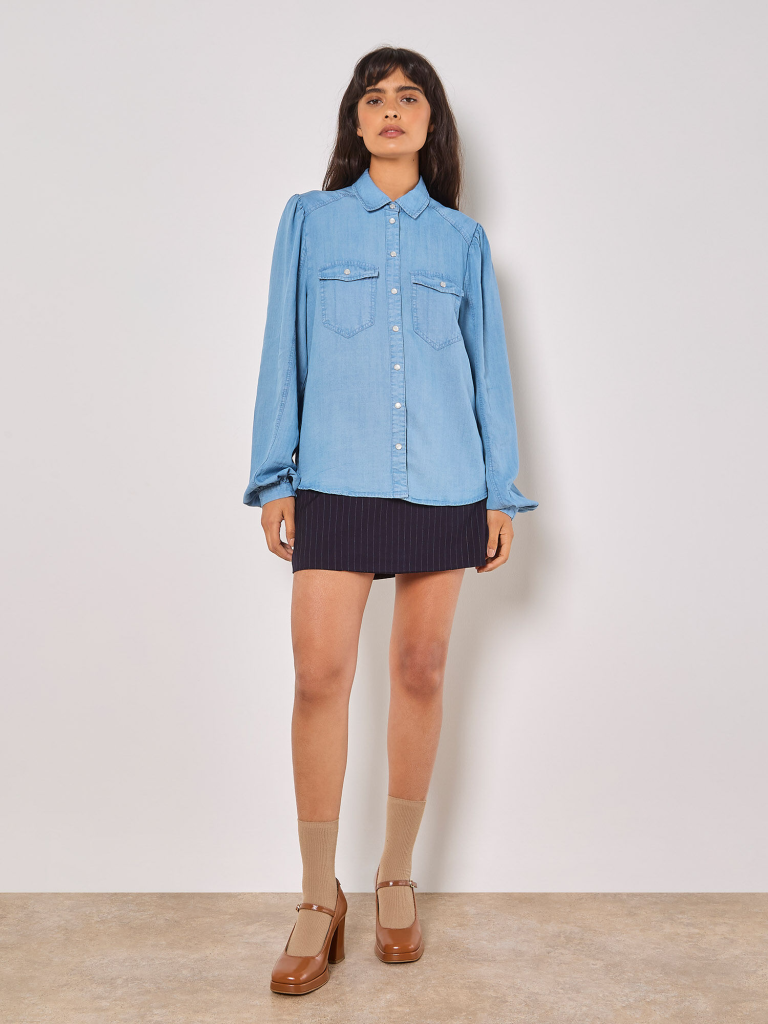 Cool and casual, this denim shirt never goes out of style. Soft and airy, it features a figure-skimming fit, snap button fastenings, and balloon sleeves. It’s finished in a timeless light wash. Wear it open, layered over a graphic tee and teamed with a mini skirt.