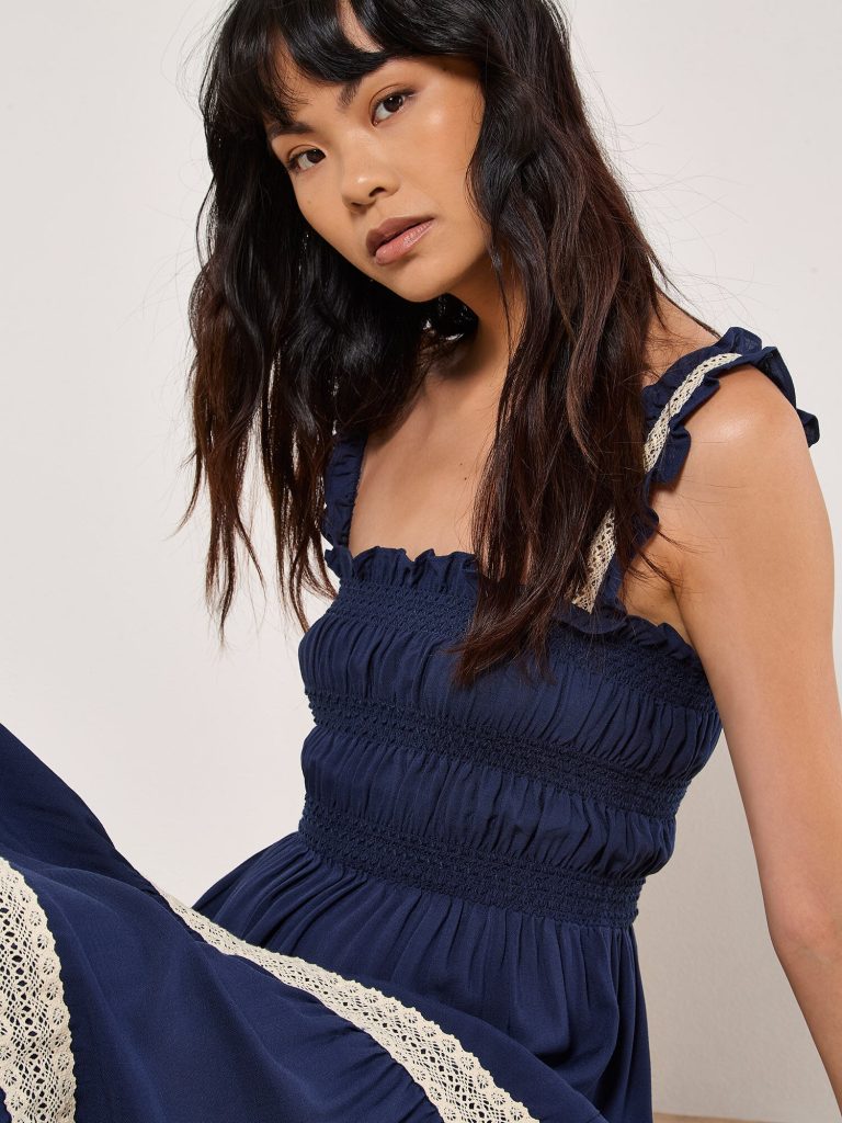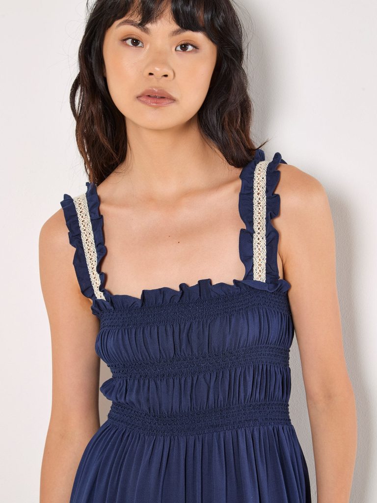 Carve a feminine silhouette in this tiered midi dress. Framed by a square neckline and ruffle straps, it boasts a smocked bodice for a flattering fit and pretty crochet lace trims. Simply style with sandals for effortless sunny day-dressing.