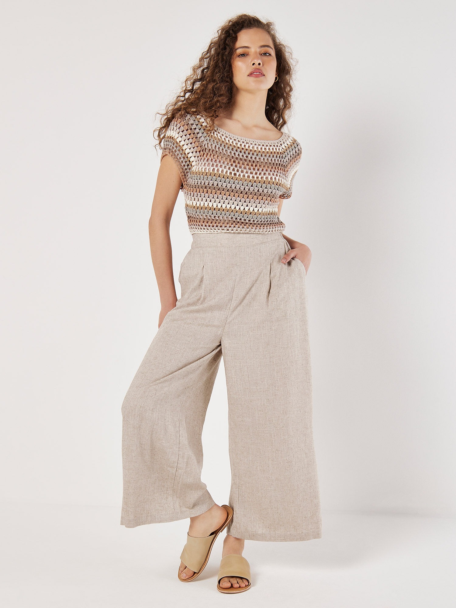 Add retro appeal to your off-duty wardrobe with this crochet crop top. Hand-knitted from super-soft yarn, it features a multi-stripe pattern in a tonal palette, a wide boat neckline and short sleeves. Style yours with a printed maxi skirt and sandals for a festival-ready finish.