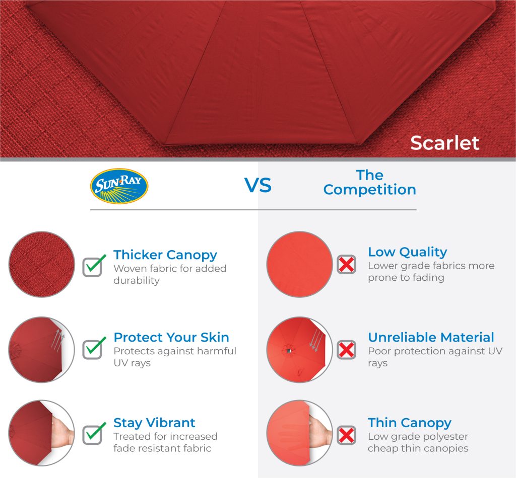 - Polyester canopy, with upgraded colorfastness and water resistant coating