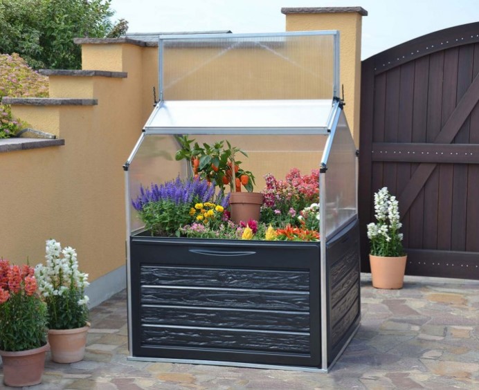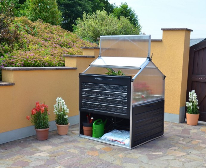- Highly resistant, polycarbonate compact small greenhouse with an embedded storage solution