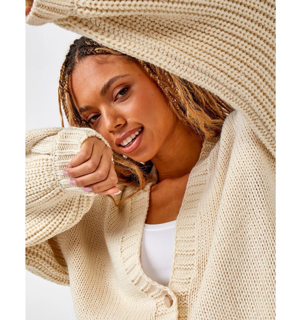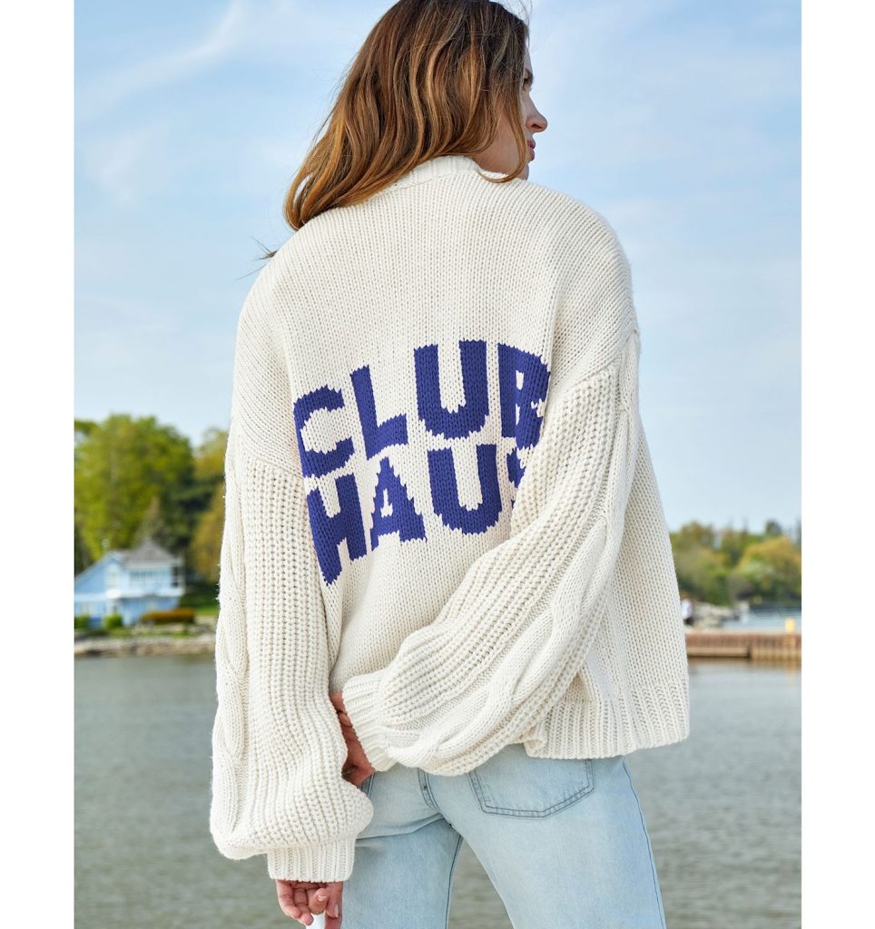 The perfect layering staple for your summer closet when you feel like being wrapped in a soft cozy hug, this Dreamy Knit Club Haus Cardigan delivers when it comes to casual coziness and super chic vibes. Designed with warm breezy days and nights in mind, this oversized statement cardigan is made from lightweight, soft, and lofty Icelandic acrylic wool yarn in a cable knit that is easy to wear and care for. Non-irritant and hypoallergenic, this chunky cardigan features long bubble sleeves, a V-neck front with two buttons, and a net back placement intarsia CLUB HAUS sentiment on the back.