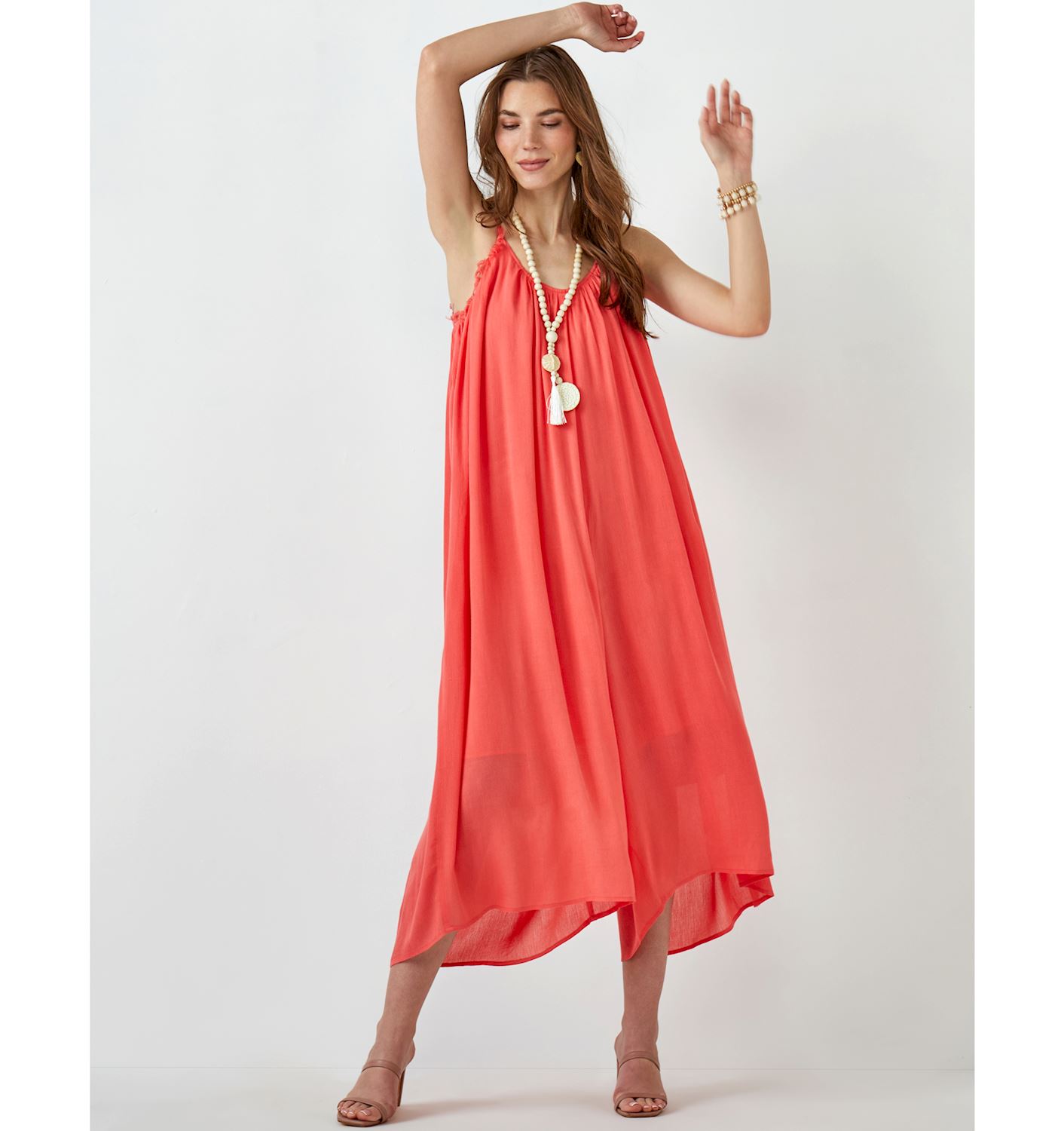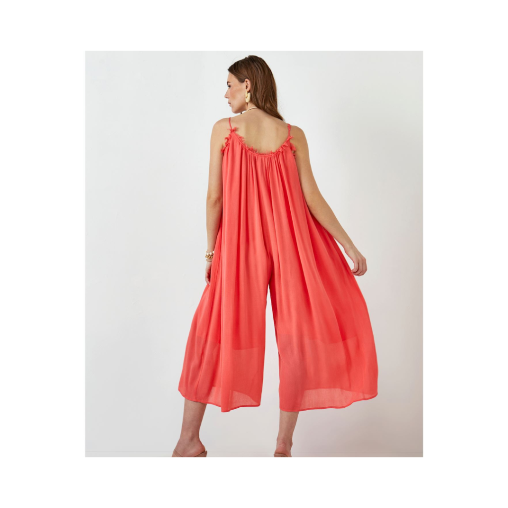 Big on style and easy on fit, this Flowy Crinkle Coral Romper features a full gathered one piece style that is flattering for all body types. Balanced with a delicate raw edge neck and armhole along the front with slender adjustable straps, this romper is fully lined with flowy wide legs and perfect side seam pockets all in a breathable rayon.