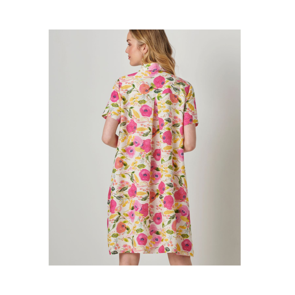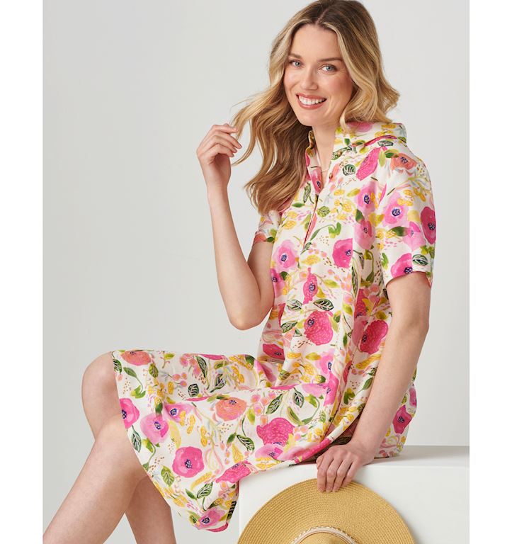 Step into summer in style with this Flowy Natural Linen Blend Dress, made in a print collaboration with the iconic artist Suzanne Allard known for her delightfully vibrant floral and garden designs. This summery ultra-chic short-sleeved dress features an elegant A-line silhouette with side seam pockets and a button front with a shirt collar. Oversize fit.