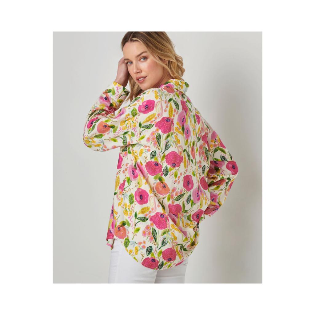A classic summer essential that anyone can pull off with ease thanks to its relaxed and flattering fit, this Linen Blend Print Shirt features a vibrant print made in a collaboration with the iconic American artist Suzanne Allard, known for her delightful floral and garden designs. With a natural linen blend, this tunic length long sleeves shirt combines a high low hemline, a button front, and clean lines for an elevated coastal retreat aesthetic.