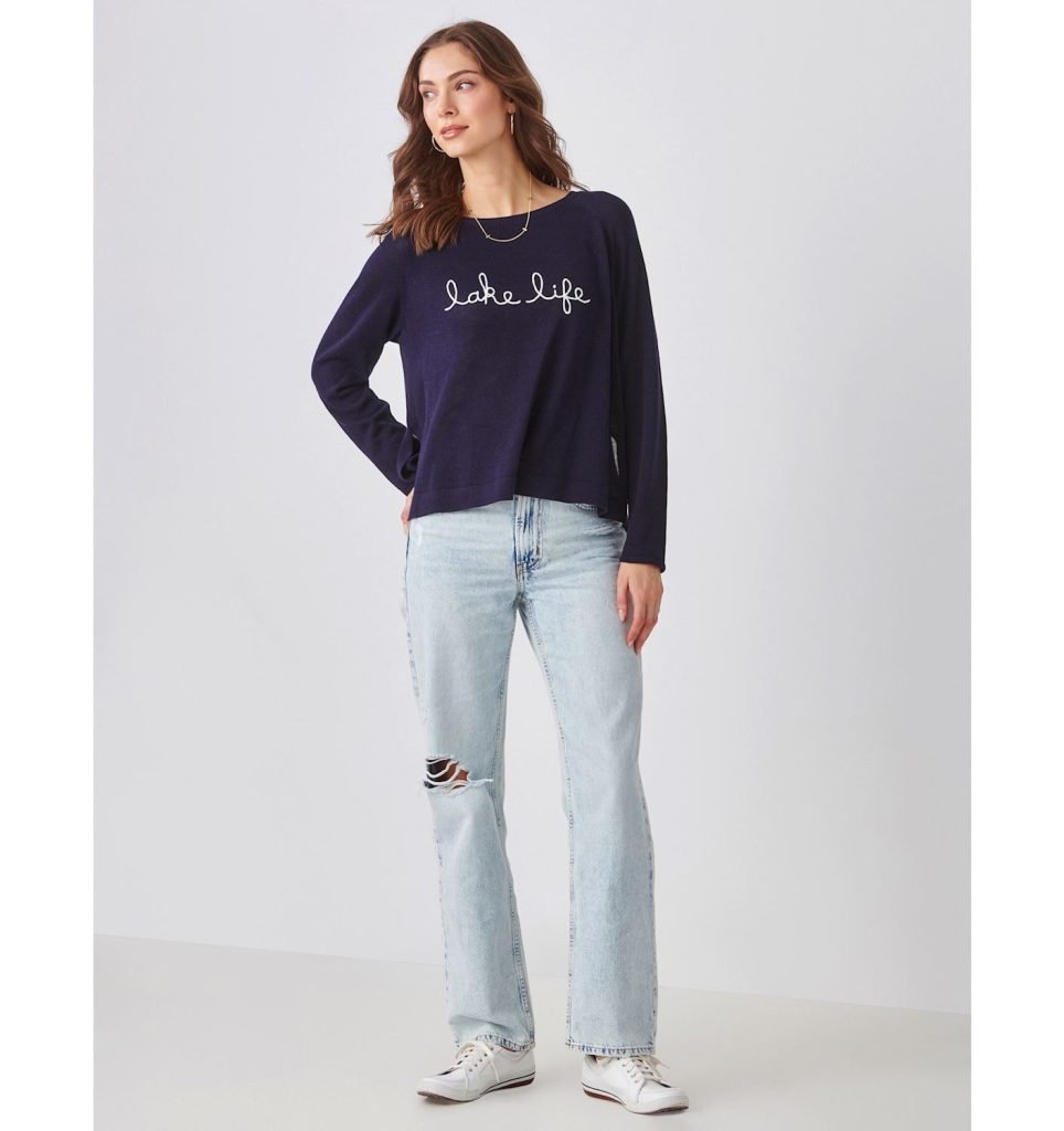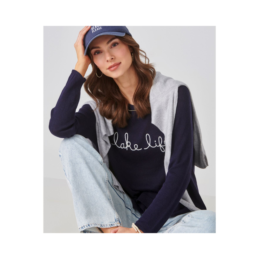 Calling out to anyone loving summer, water and just relaxing, these fantastic natural cotton blend fine gauge knit sweaters are made in a Long Sleeve Crew Neck Pullover and are ready to go wherever you go. They have a fantastic statement LAKE LIFE in a chain stitch embroidery.