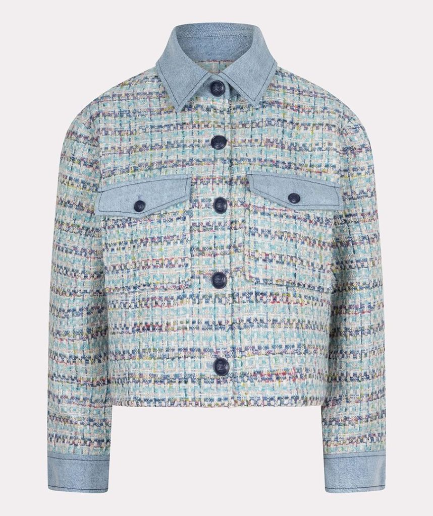 The Jacket Tweed Jeans Accent Blue by Esqualo combines classic tweed with a modern denim touch. The short fit and striking details make this jacket perfect for a stylish and trendy look. Pair this Jacket with a t-shirt or sweater in one of the many colors from the fabric or with the matching skirt.