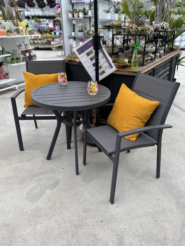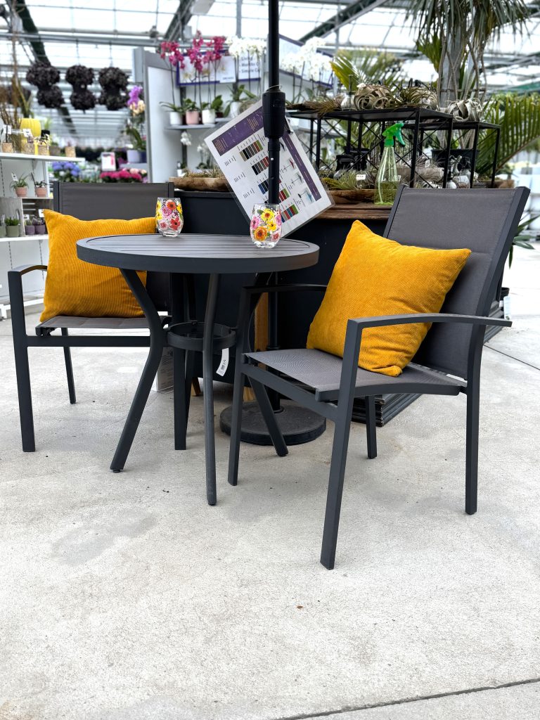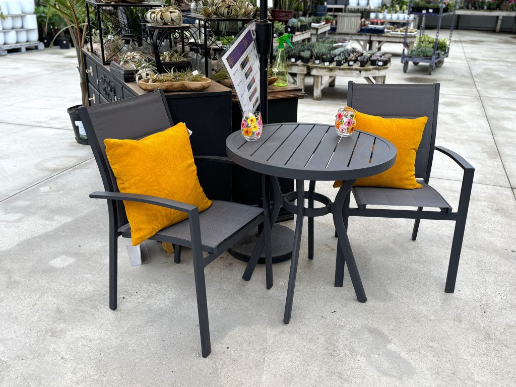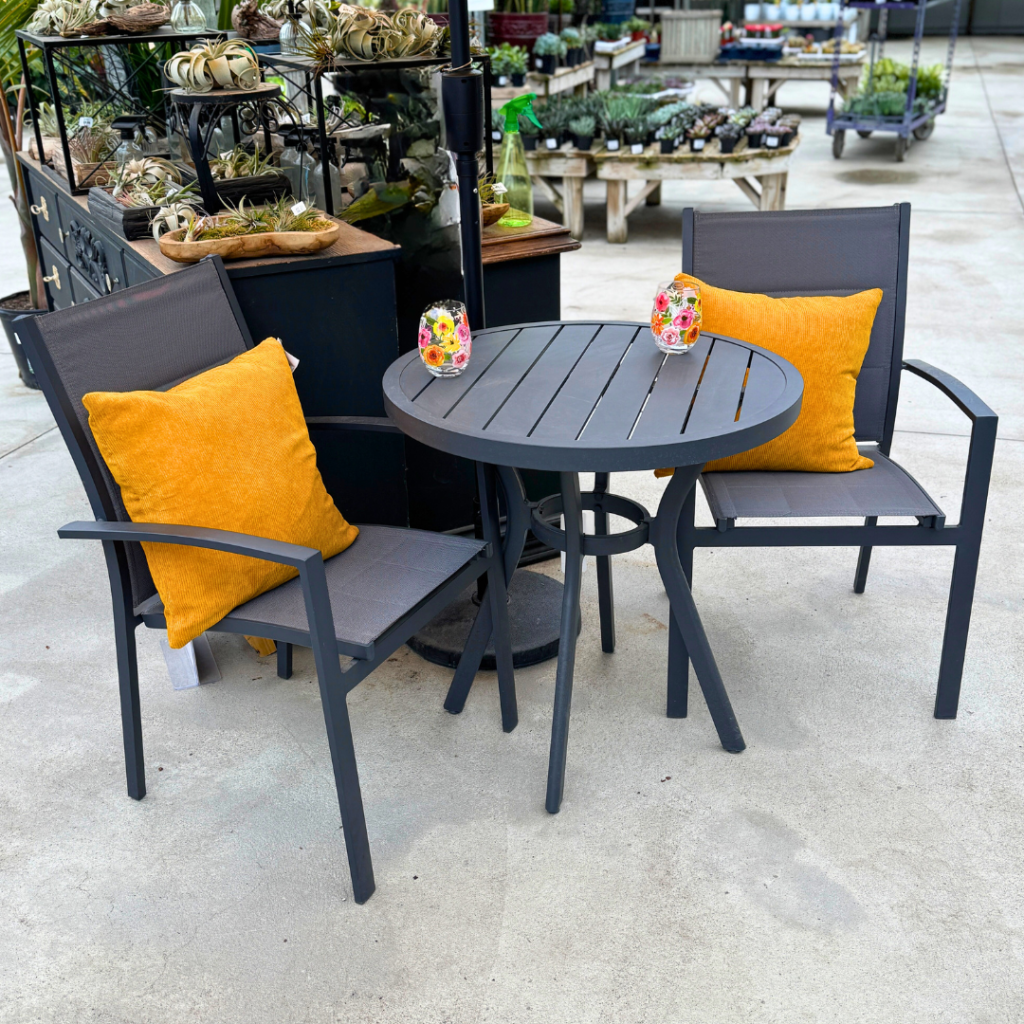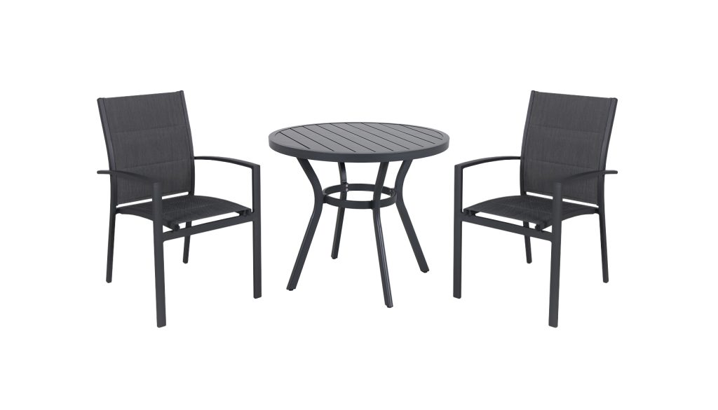 Add class and simplicity to any living space with the Estancia 3 Piece Bistro Set. The set is constructed with fully welded powder coated aluminum frames providing both strength and longevity. The padded sling textilene provides superior comfort without the need for cushions. An idea place to sit and relax for hours. The generously sized rounded aluminum table has adjustable feet in matching gunmetal black. This set is great for small spaces!