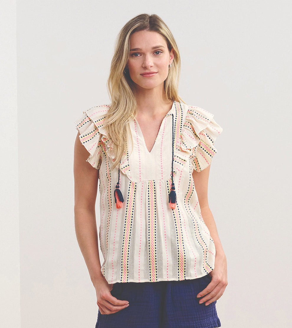 The Alexa Popover in Ribbon Weave Stripes offers a sophisticated take on casual styling. Made from a viscose and cotton blend, it features a lightweight feel, an open neckline, and a relaxed fit. The ribbon weave stripe pattern, handcrafted tassels, and ruffles add a touch of texture and feminine elegance. Perfect for layering or wearing alone, it pairs beautifully with trousers or skirts.
