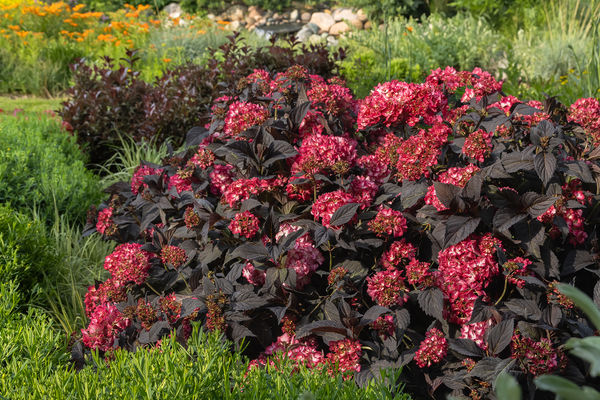Hydrangeas are a classic fit in many gardens. Hydrangea Eclipse is the first true dark-leaf mophead variety. Dark purple almost black leaves all season long contrast with the vibrant cranberry and white blossoms. Depending on soil conditions, they may have an amethyst hue. This reblooming hydrangea will bloom all summer long. Grows 3-5′ high and wide. Part sun – morning sun with afternoon shade is best. |
