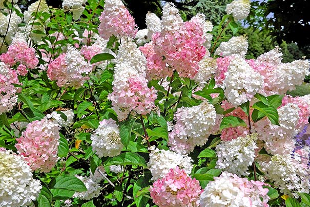 This panicle hydrangea boasts huge cone shaped blooms that emerge white and change to pink. Grows 6′ high and wide. Full sun to part sun.