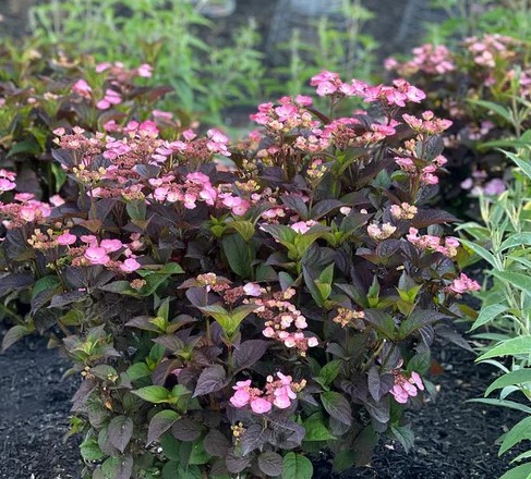 ‘Pink Dynamo’ Hydrangea by Bloomin’ Easy shrubs offers vibrant, hot pink lacecap flowers that rebloom over silky, black foliage from late spring through summer. An eye-popping experience like no other! Grow in partial sun.