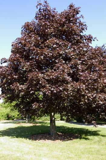 | The Royal Red King Maple has burgundy leaves that last all through the summer and into fall. As a specimen, this tree is a star with its consistent dark burgundy foliage. It has a more compact and slightly narrower habit than many other maples. It is a slower grower and is good in urban setting as it is tolerant of a wide variety of conditions. Grows 30′ high and 25′ wide.