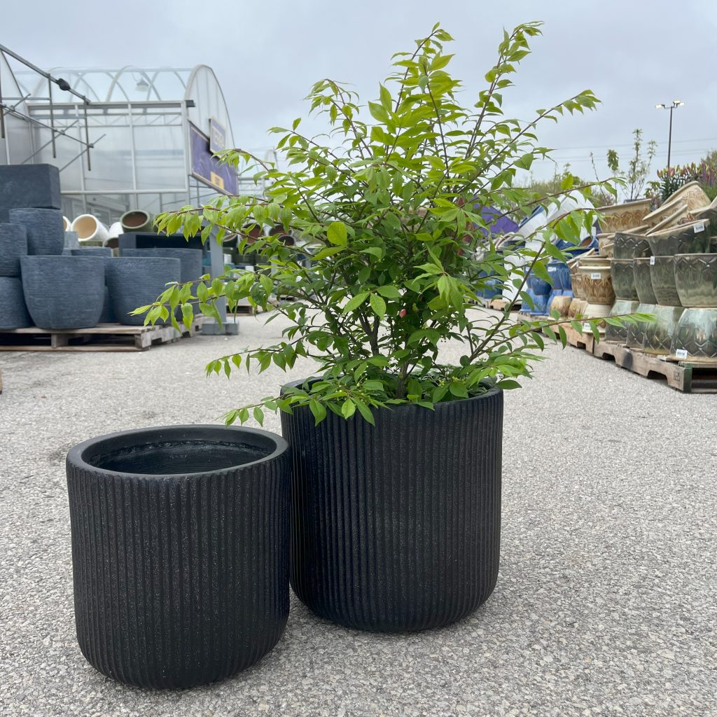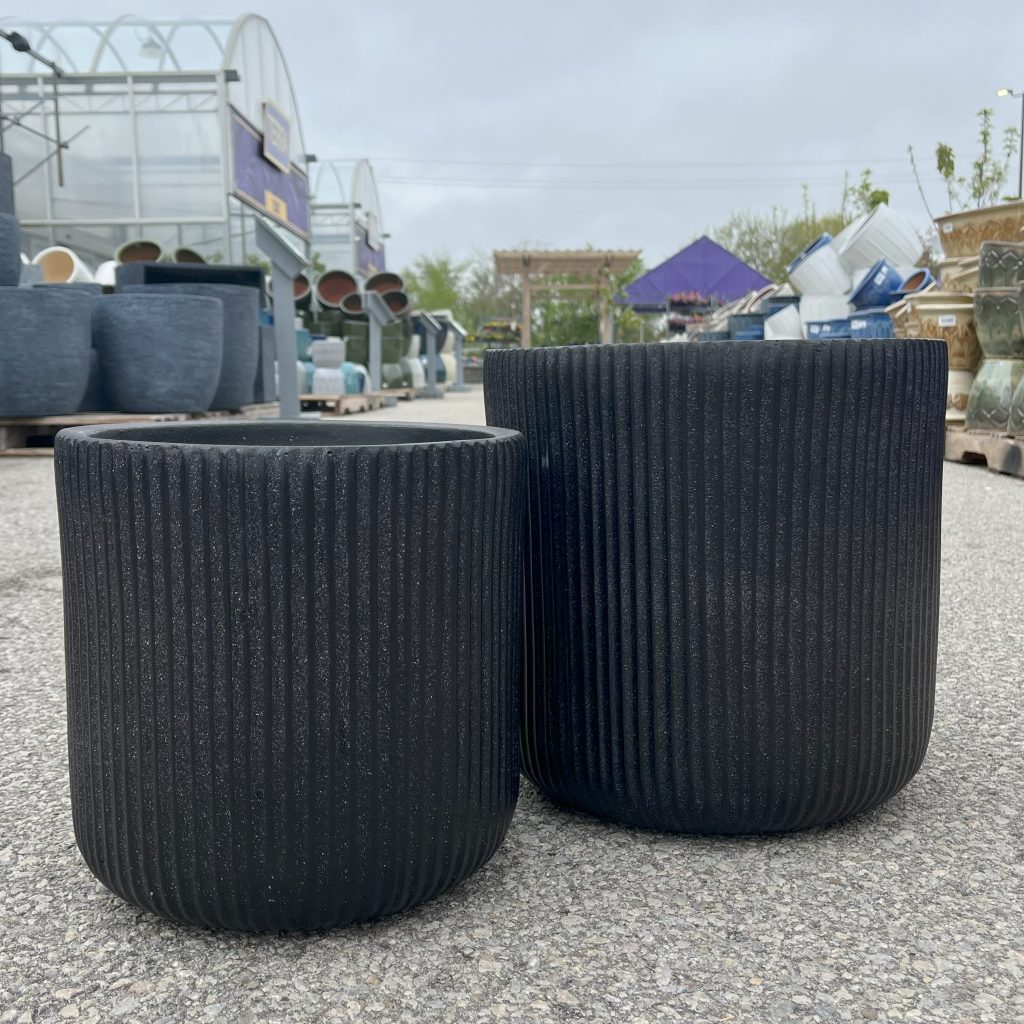 Elevate your garden or patio with these sleek Nuovo Fibreclay Round black outdoor planters, designed with a refined ribbed texture that adds to the modern and classic style. Crafted for durability and frost resistance, their modern matte finish and minimalist silhouette make them the perfect accent for any backyard or patio. Available in multiple sizes to suit plants of all types, these pots blend seamlessly into both urban balconies and lush backyard retreats.
