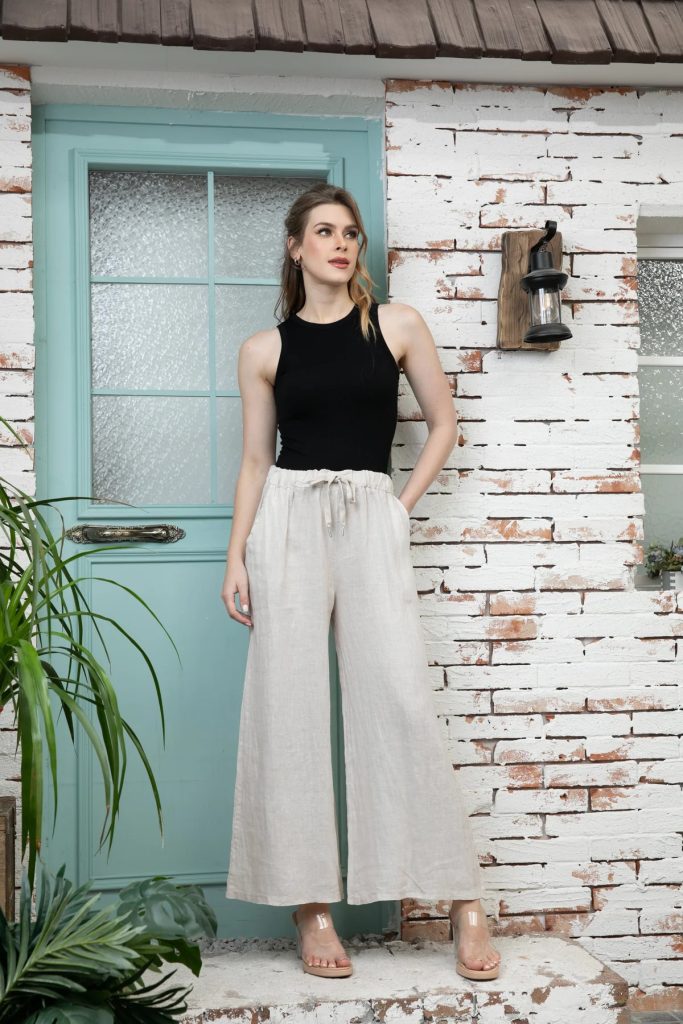 Introducing our 100% linen pants in a stylish gaucho cut. These wide-leg pants offer a relaxed and comfortable fit, perfect for any summer outing. The drawstring allows for a customizable fit, while the slanted front pockets provide added convenience. Upgrade your wardrobe with these versatile and breathable pants.