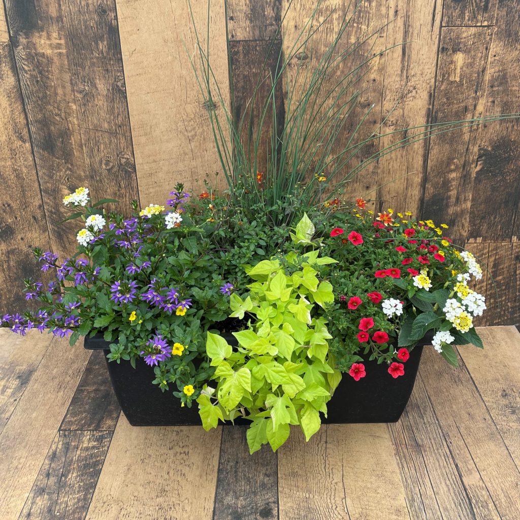 A Grower’s Mix of sun loving, colourful and textured annuals. A great addition to any railing (fits either 4″ or 6″ railing). Full sun to partial shade. Water regularly to keep soil moist.