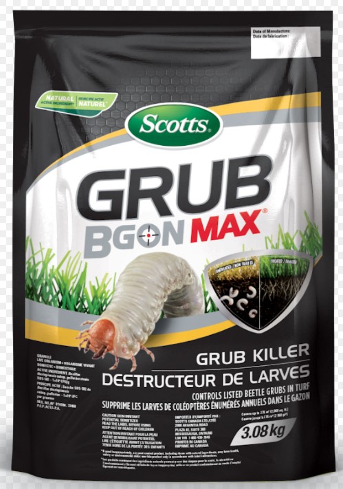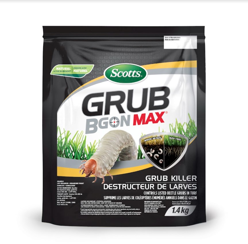 Dead or brown patches in the turf? Turf that easily lifts up and peels back, revealing sorry-looking roots (or none at all)? Dig-holes caused by skunks or raccoons? The culprit is most likely grubs. Stop grubs by applying Scotts® Grub B Gon® MAX Grub Killer, then watering-in to a depth of about 1.25 cm. When applied as directed, the active ingredient – a live, soil-borne organism – is released down into the soil and root zone where grubs live. As grubs eat plant roots, they also ingest the active ingredient, effectively putting a stop to them and their destruction. Controls a variety of beetle grubs, including June beetles and chafers.*