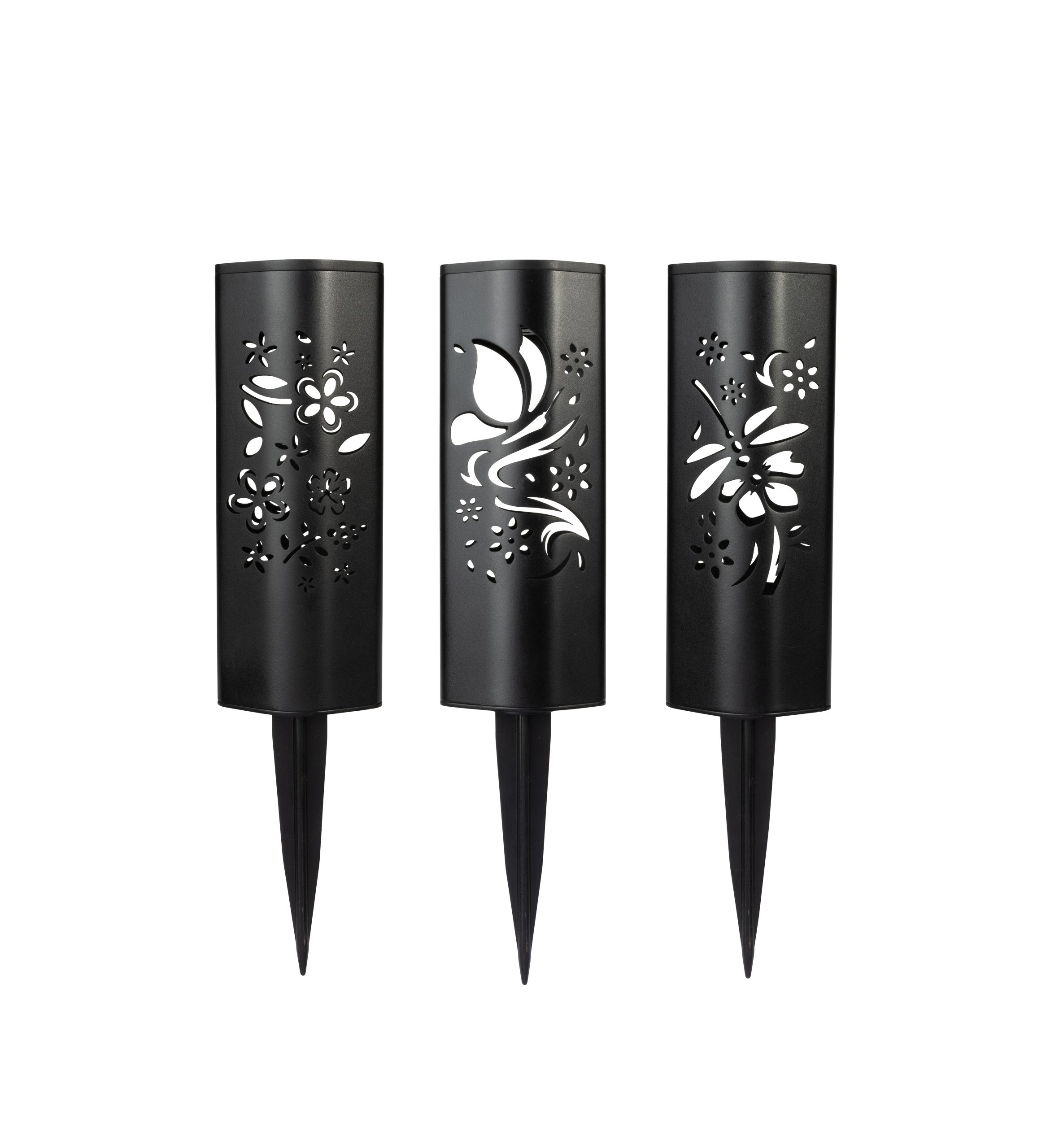 Illuminate your garden with this outdoor solar stake light, featuring stunning cutouts so the light shines through. This eco-friendly light harnesses solar power to provide a warm, ambient glow, perfect for pathways, flower beds, planters, and patios.