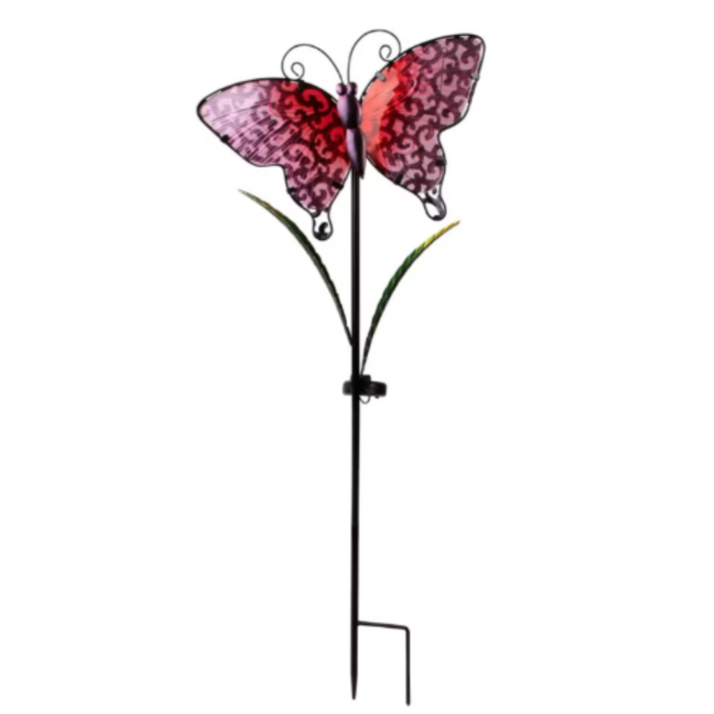This all metal and solar stick light is a brand new design and is highlighted by a large metal butterfly design with patterned detail and integrated LEDs to light up at night. The butterfly features 15 warm white LEDs within the design that light up at night to illuminate the overall design.