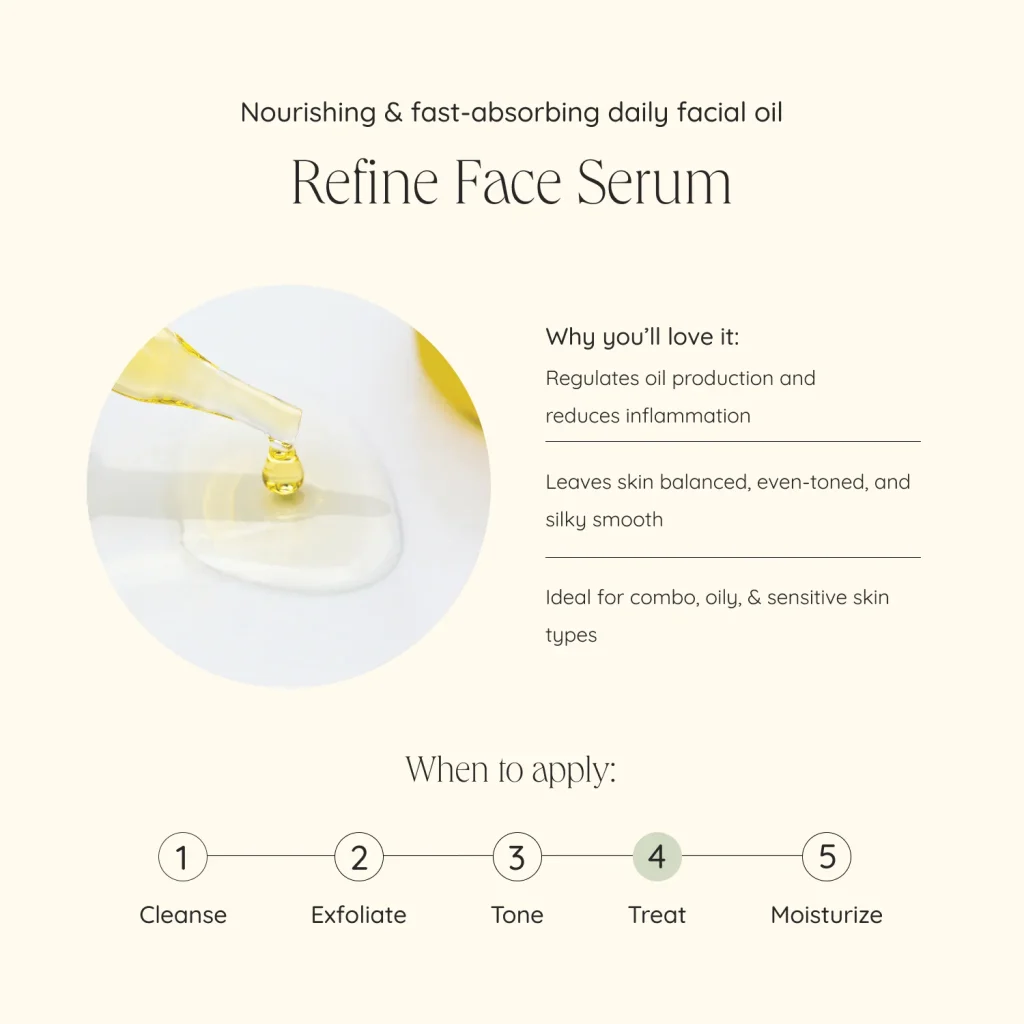 Refine Face Serum is packed with a highly concentrated blend of plant powered oils, this lightweight and fast-absorbing serum is formulated with squalene and sacha inchi to hydrate and boost collagen while clearing skin congestion, leaving skin balanced and silky. The cleansing properties of juniper help to regulate oil production and maintain skin’s elasticity while raspberry seed reduces inflammation caused by breakouts. Perfect on its own or layered under a cream or lotion during dryer months. Ideal for combination to oily skin prone to breakouts.